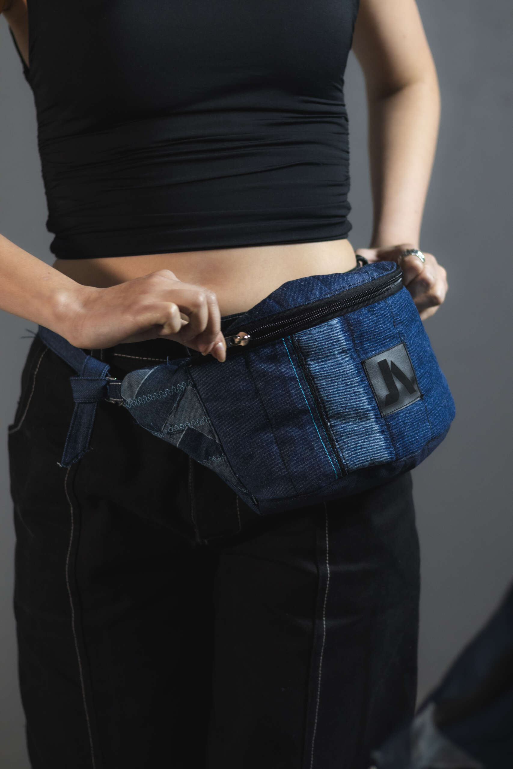 Canguro en denim elaborado artesanalmente con la técnica de patchwork.
