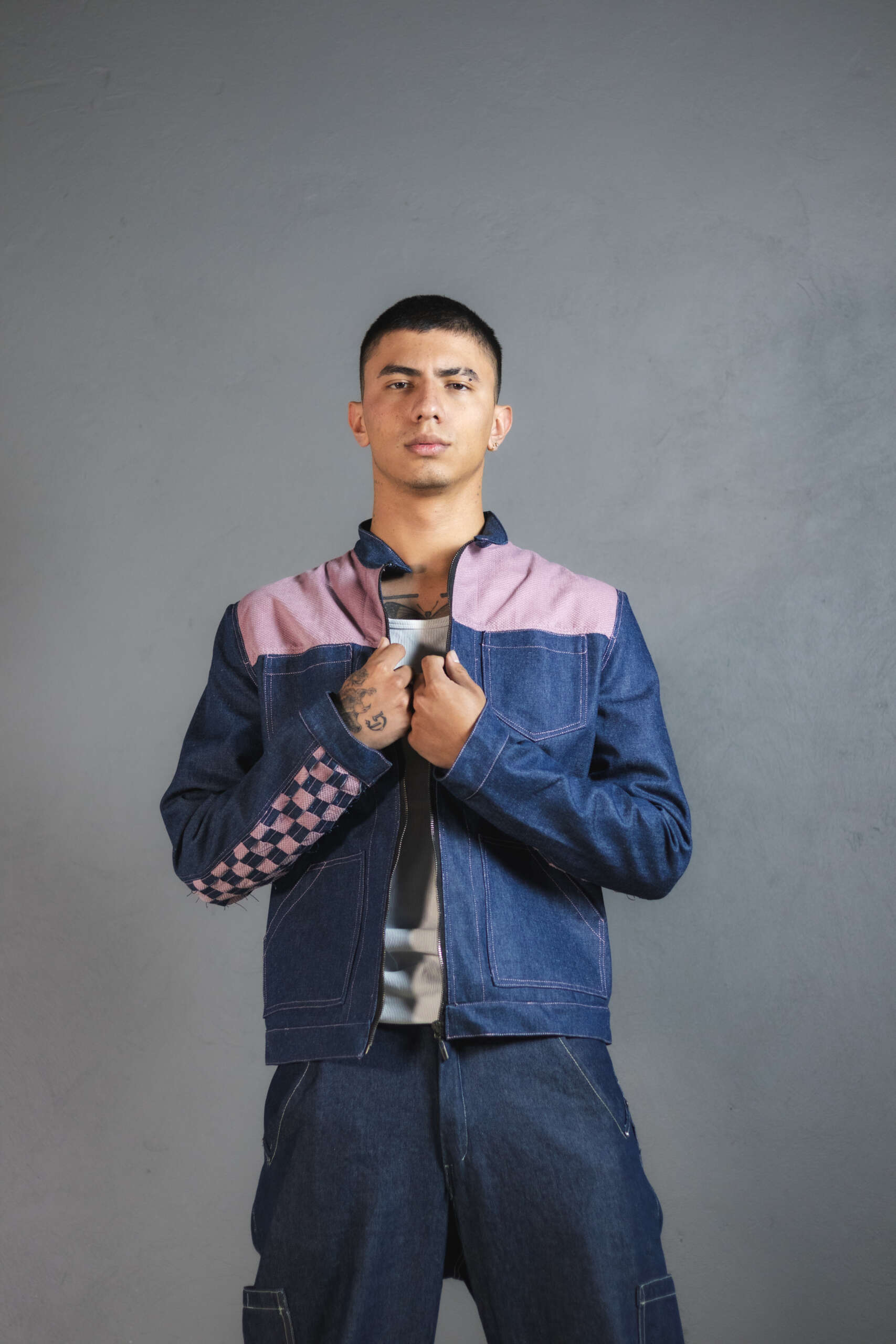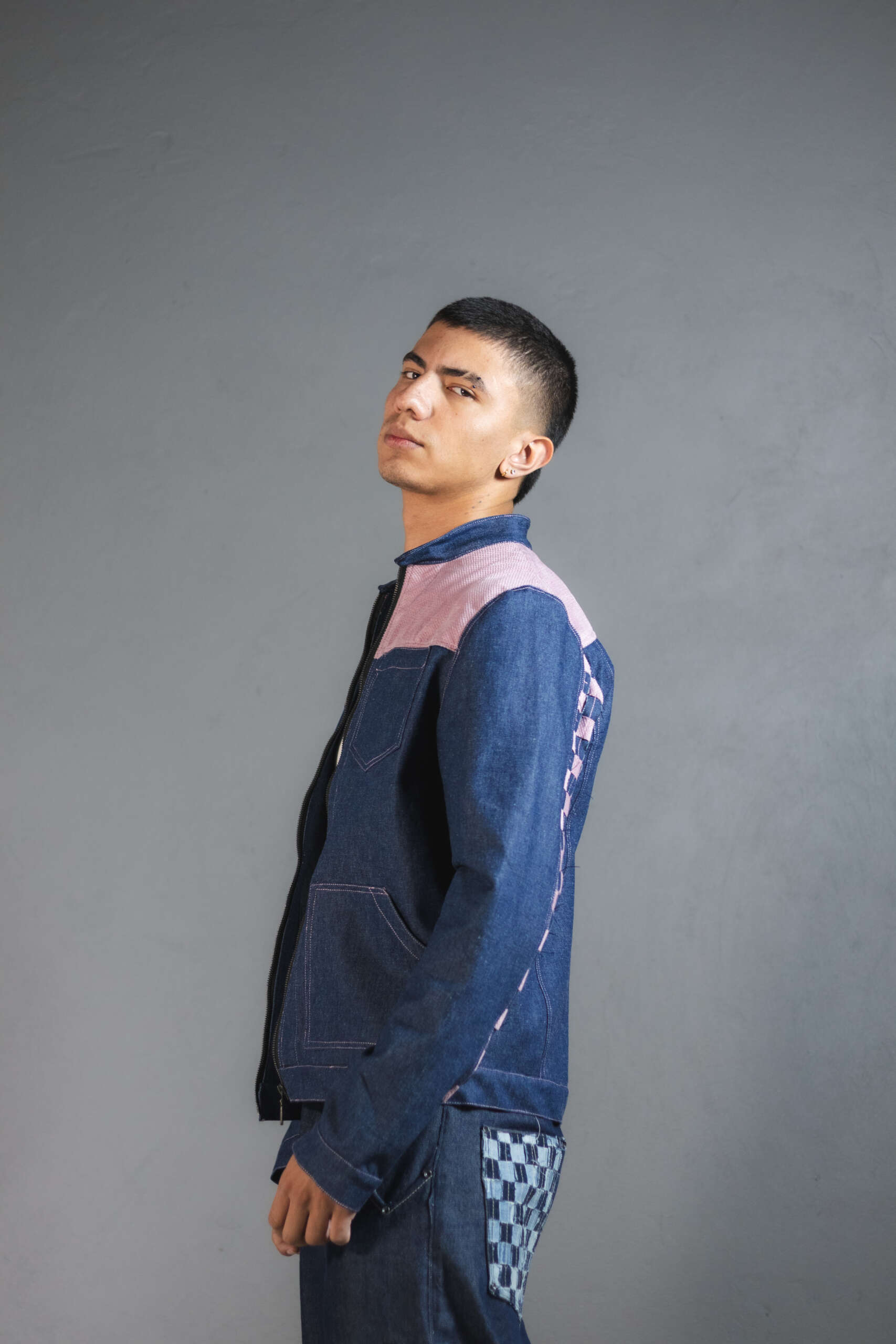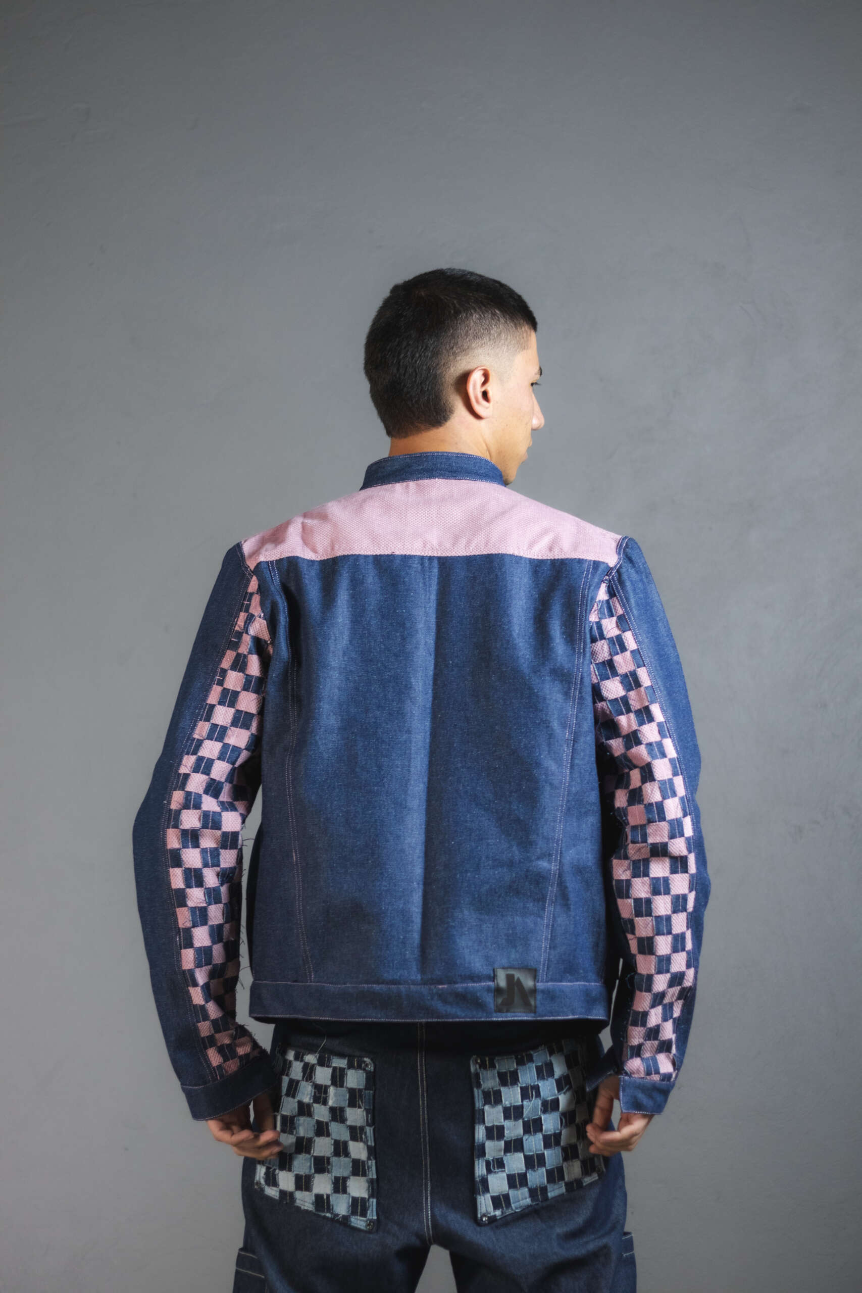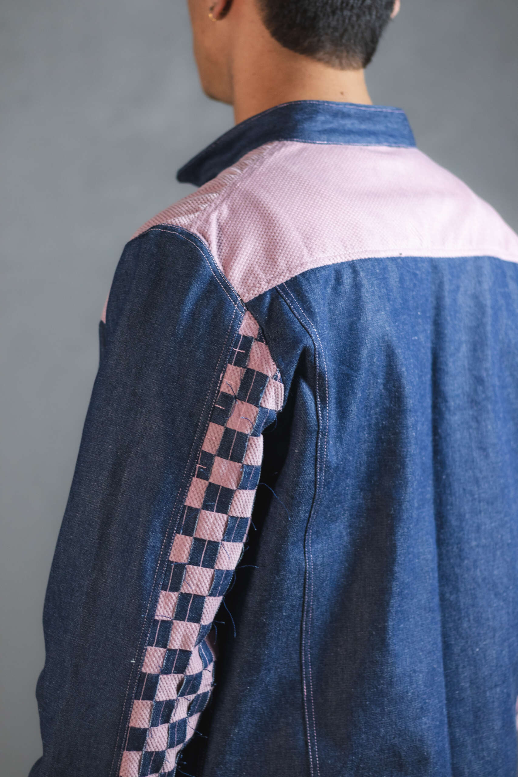 Con experimentaciĂłn textil en las mangas compuestas por tiras entrelazadas una a una para generar contrastes en rosa y azul. Una pieza irrepetible, creada con upcycling de alta calidad.