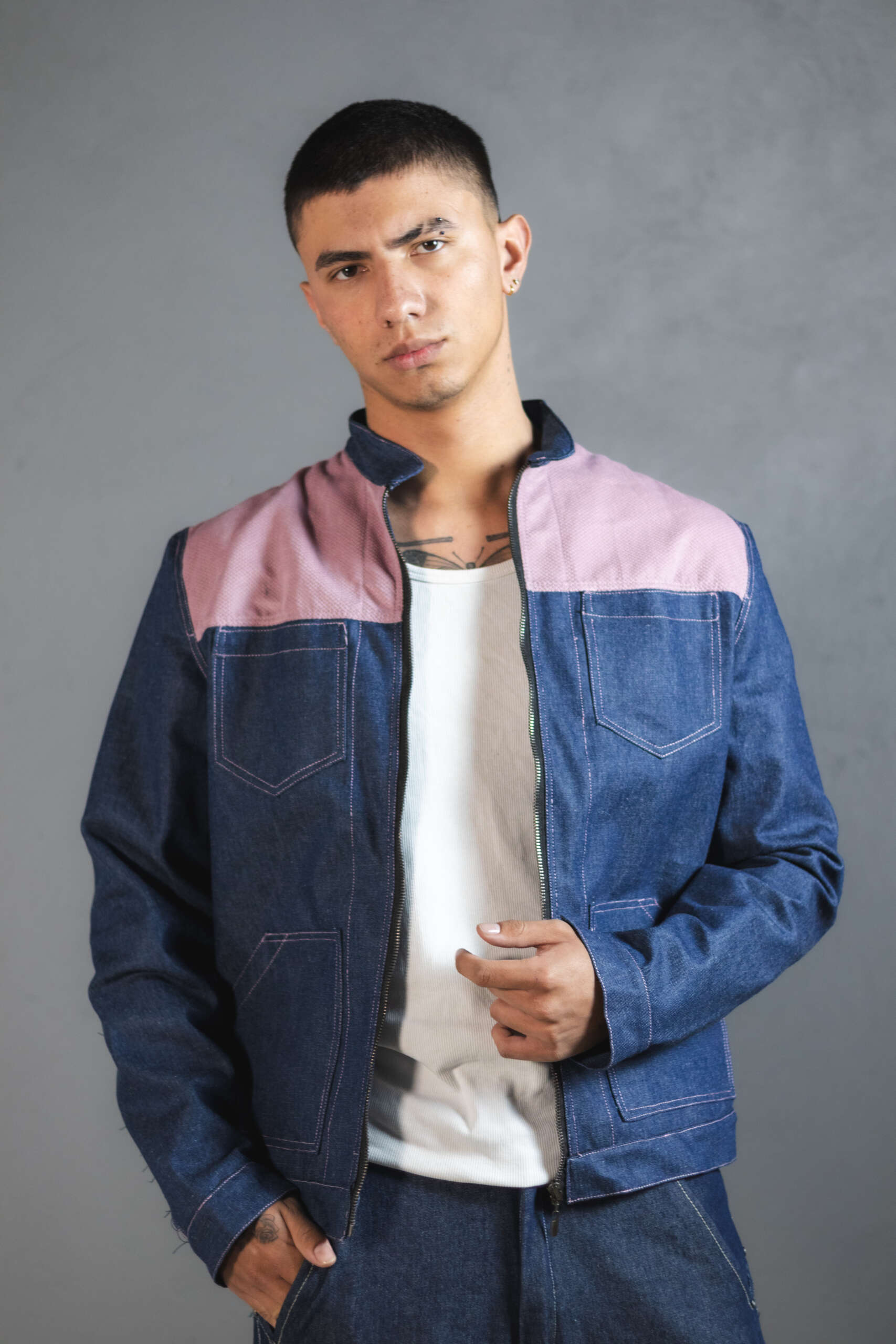 Chaqueta Ășnica en denim azul noche, elaborada artesanalmente en Colombia.
