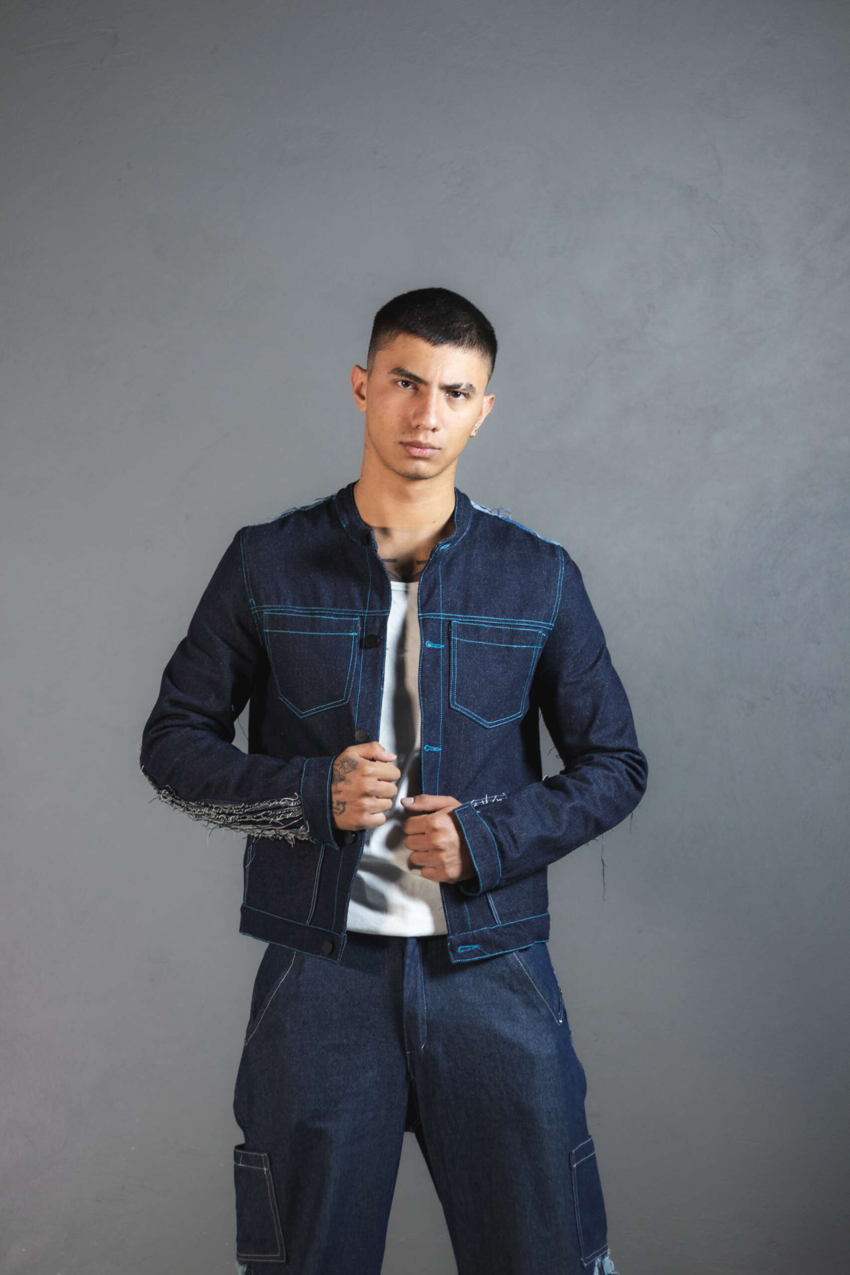 Chaqueta Ășnica en denim azul noche, elaborada artesanalmente en Colombia.