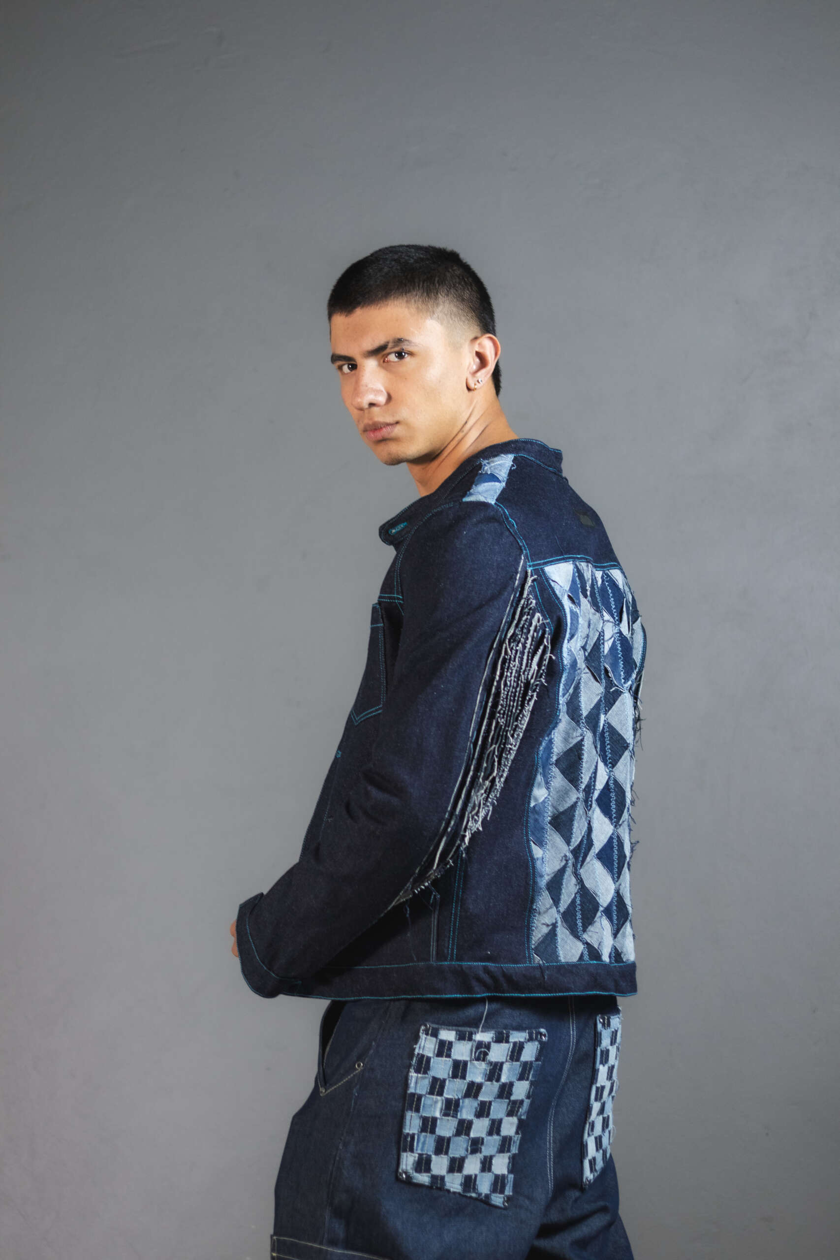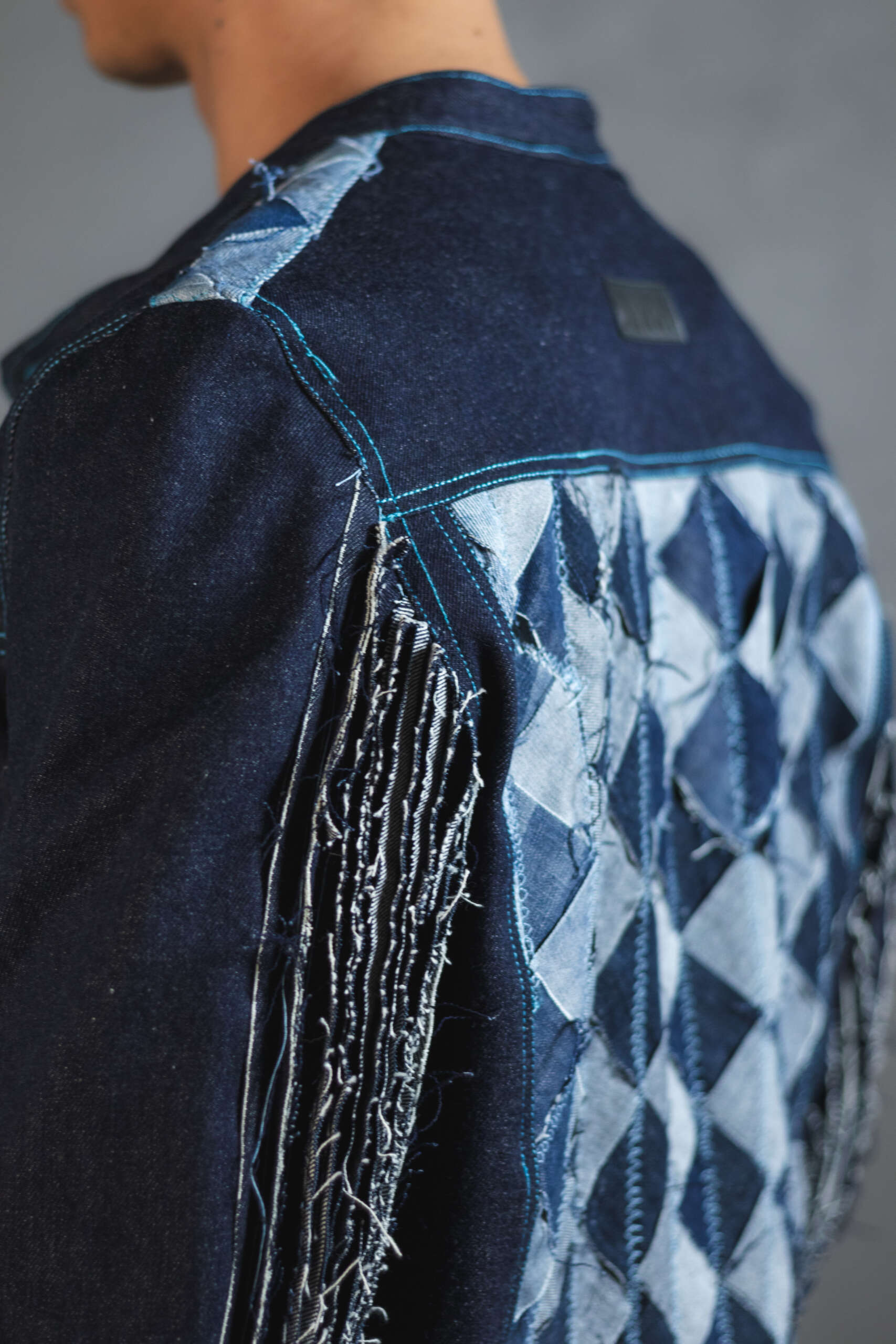 Con experimentación textil en la espalda compuesta por fragmentos geométricos ensamblados uno a uno para generar contrastes en diferentes tonos de azul que resaltan su caråcter exclusivo.