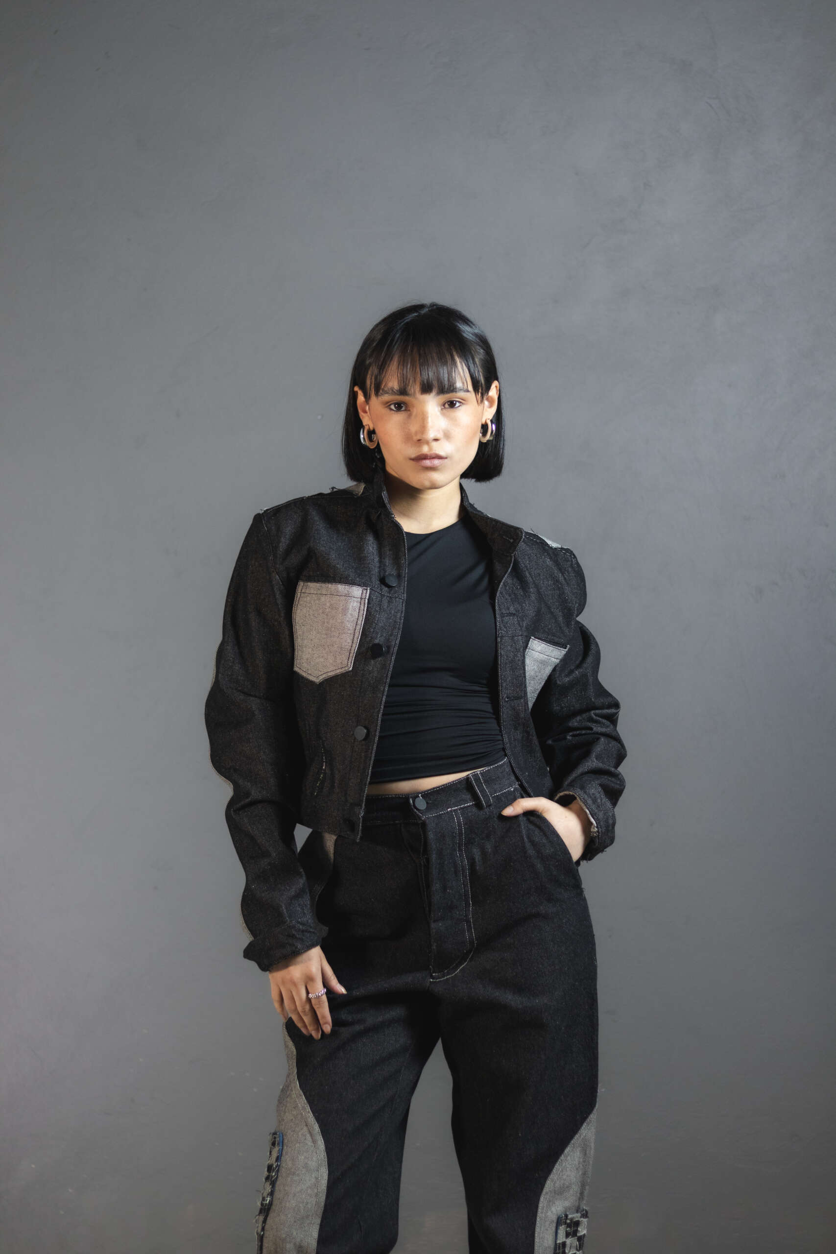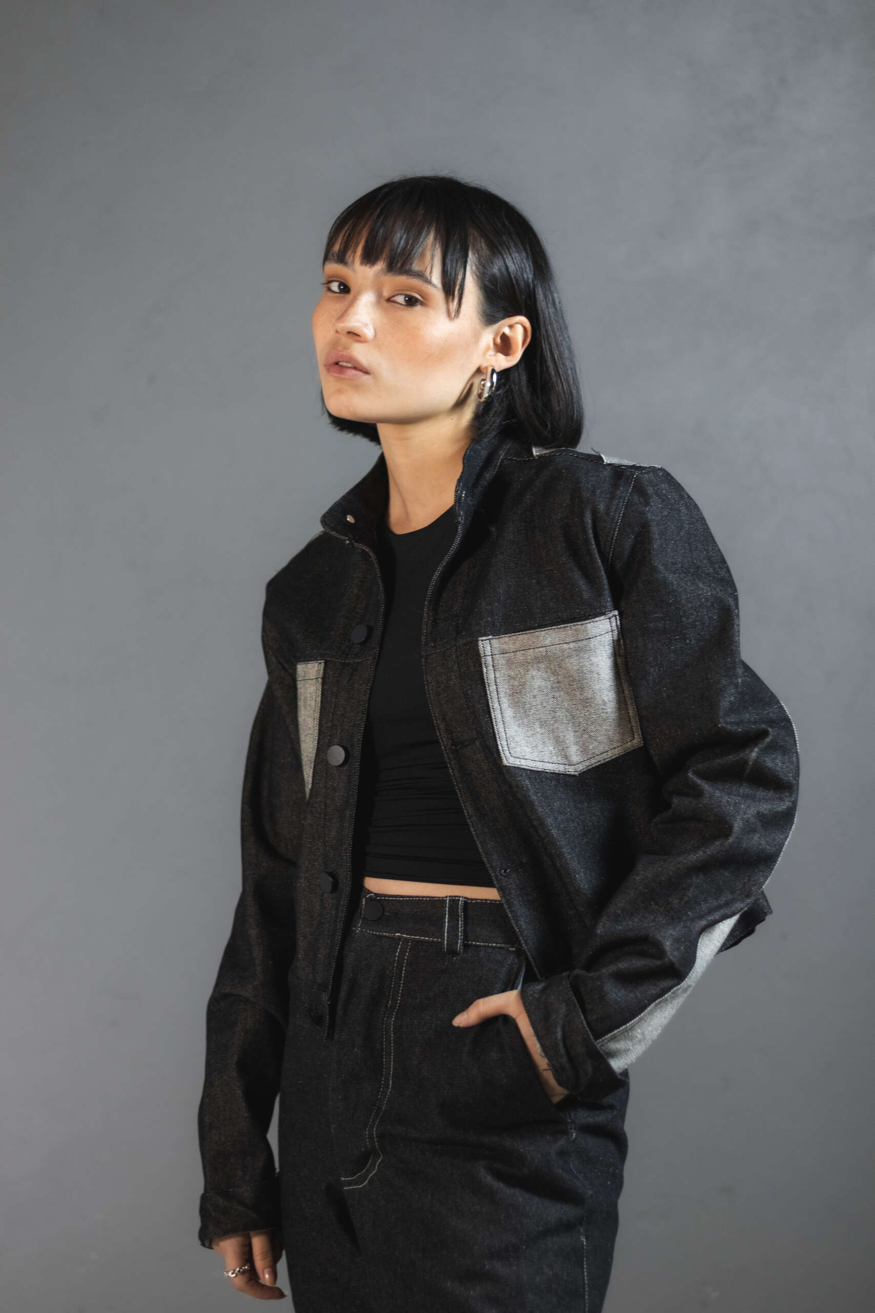 Chaqueta Ășnica en denim gris oscuro, elaborada artesanalmente en Colombia.