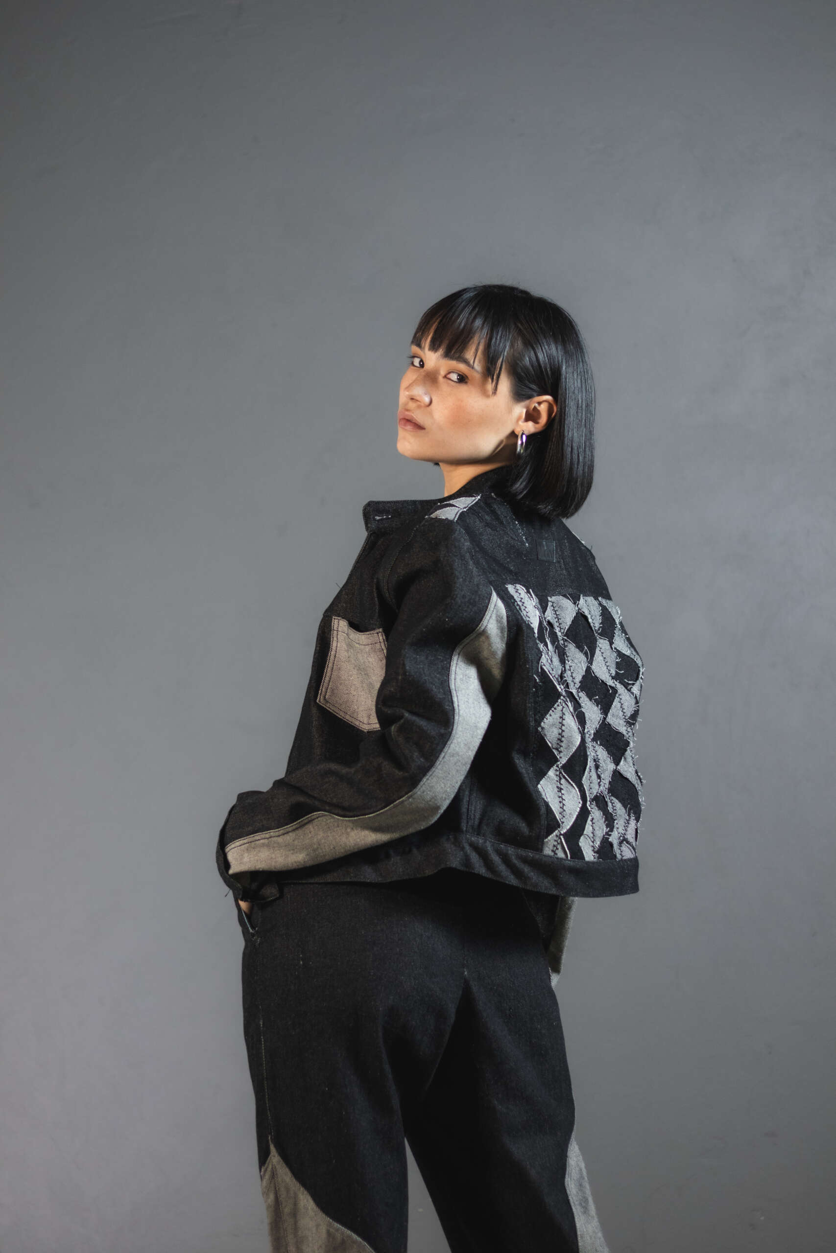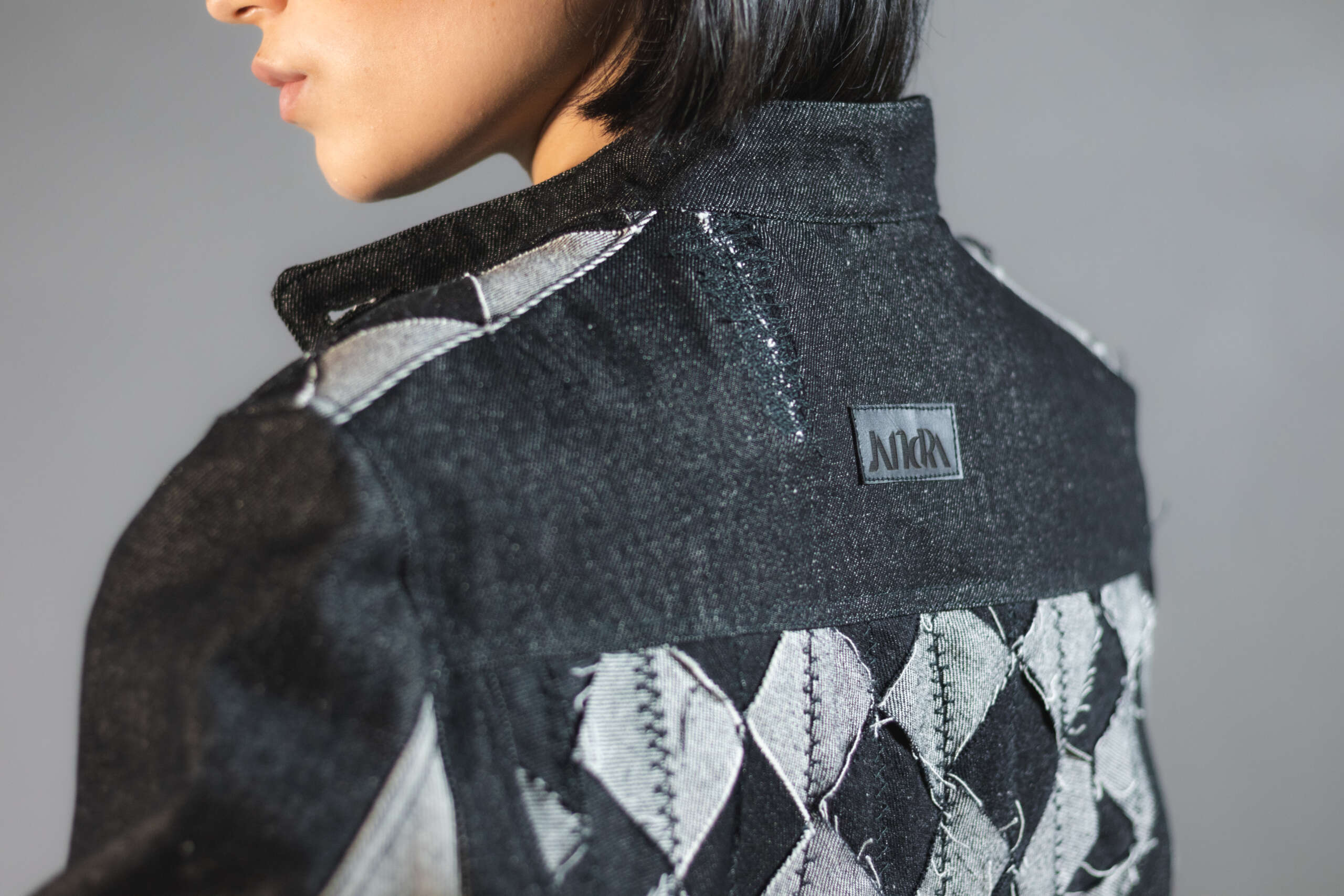 Con experimentación textil en la espalda compuesta por fragmentos geométricos ensamblados uno a uno para generar contraste. Una pieza irrepetible, creada con upcycling de alta calidad.