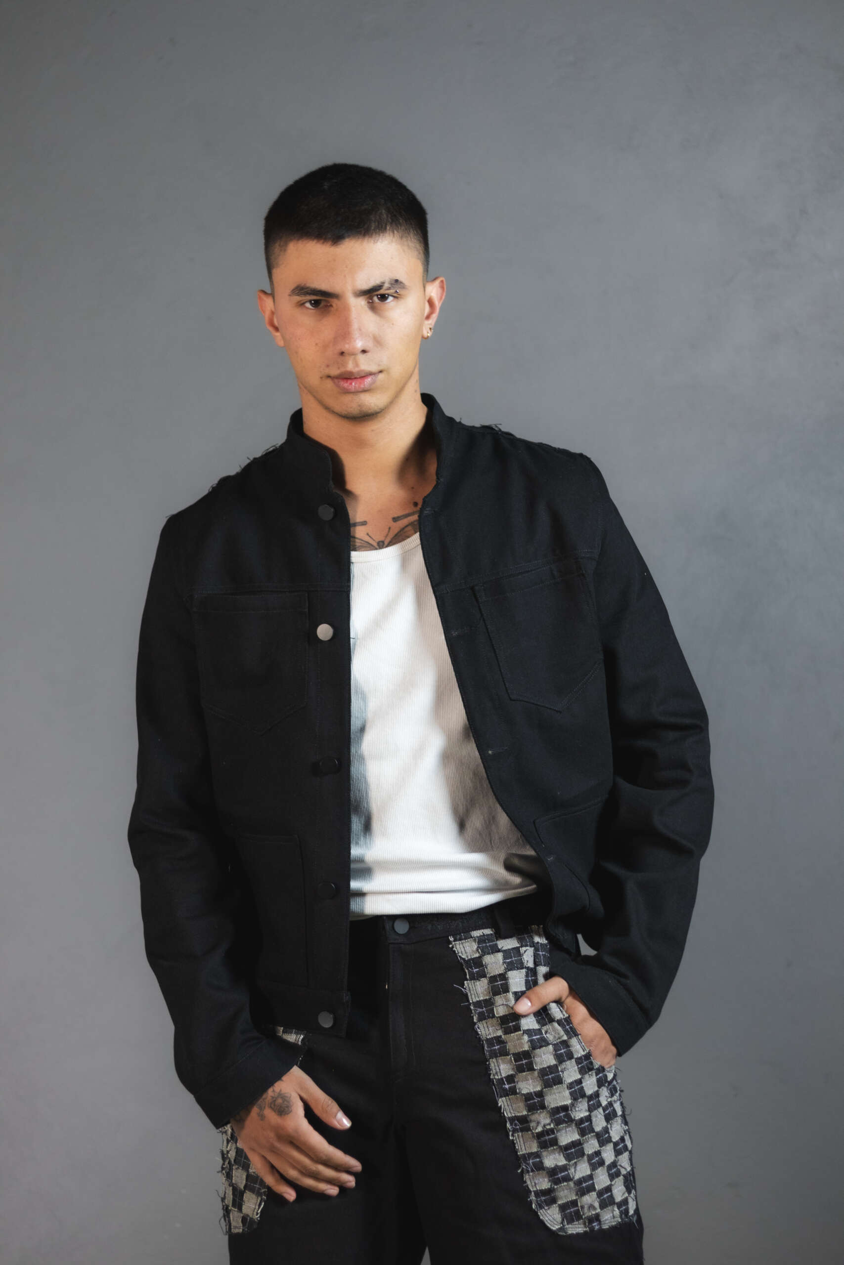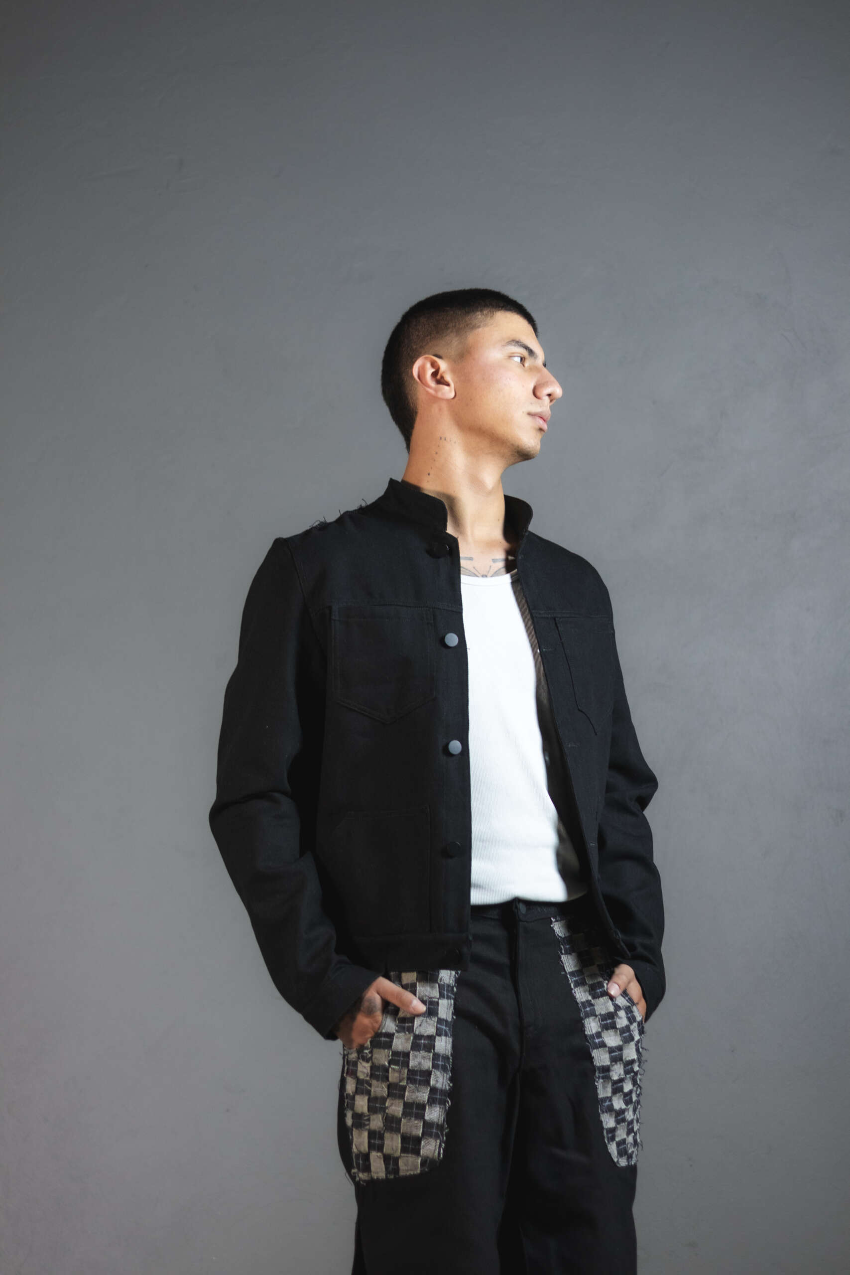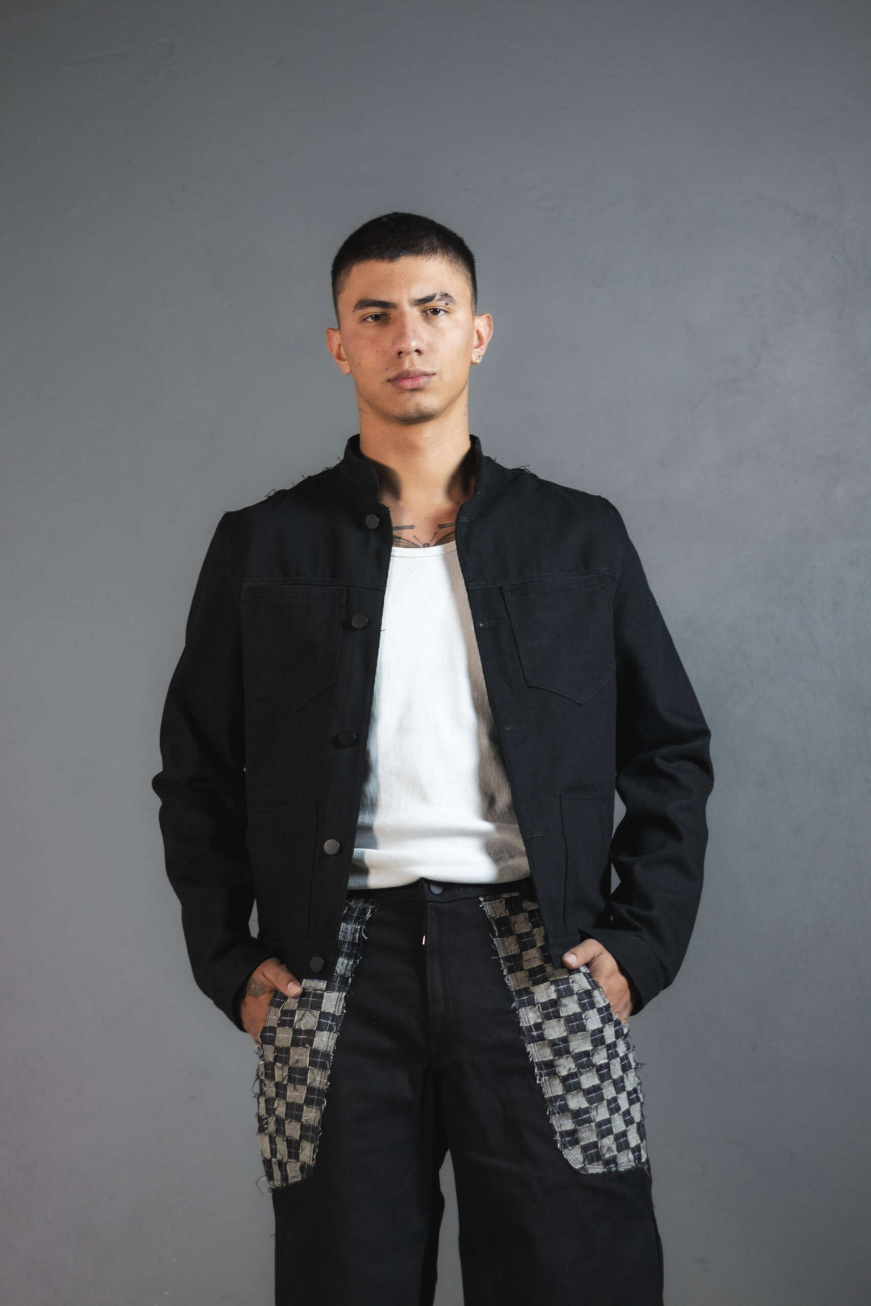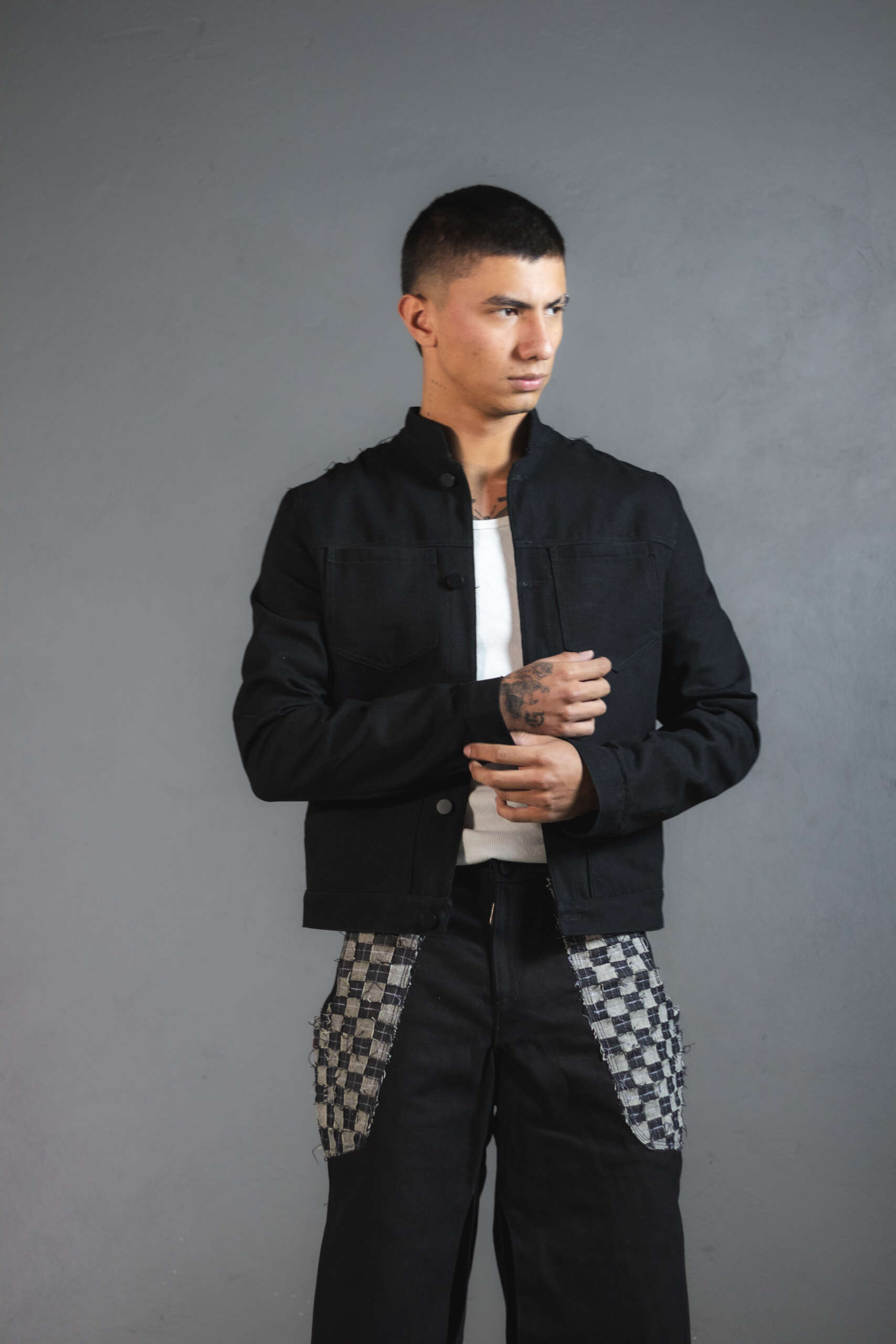 Chaqueta Ășnica en denim negro, elaborada artesanalmente en Colombia.