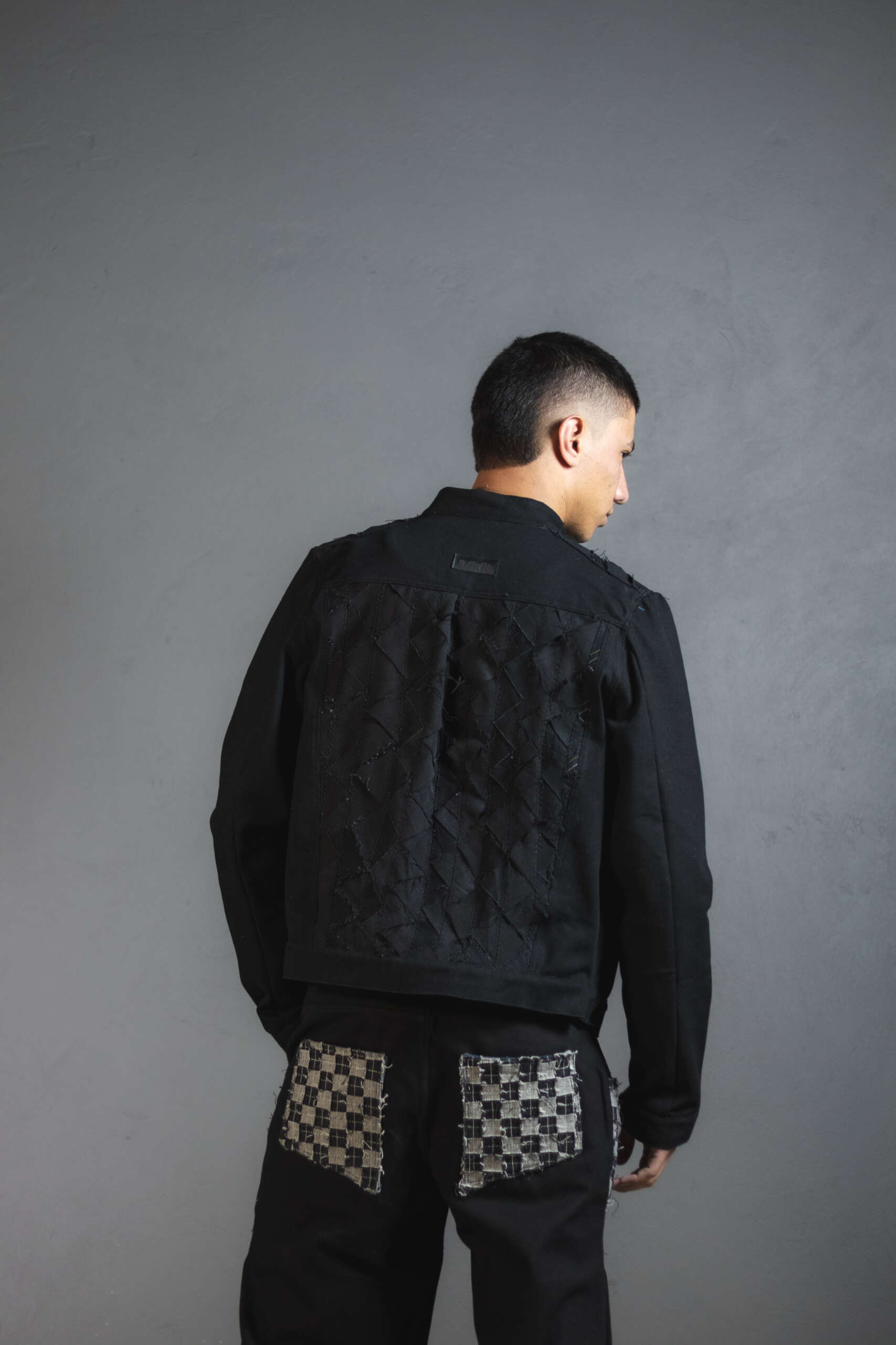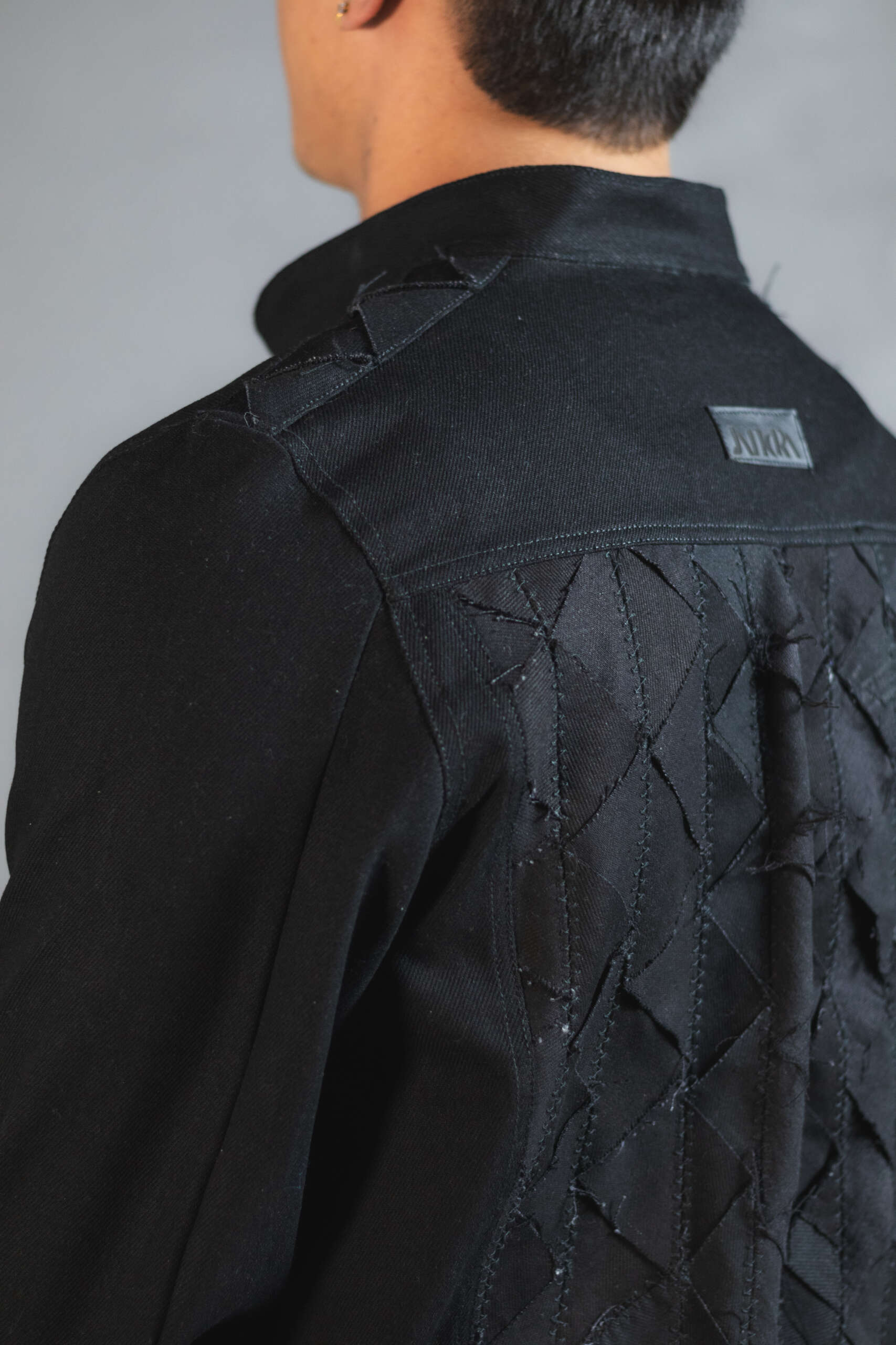 Con experimentación textil en la espalda compuesta por fragmentos geométricos ensamblados uno a uno para generar contraste. Una pieza irrepetible, creada con upcycling de alta calidad.