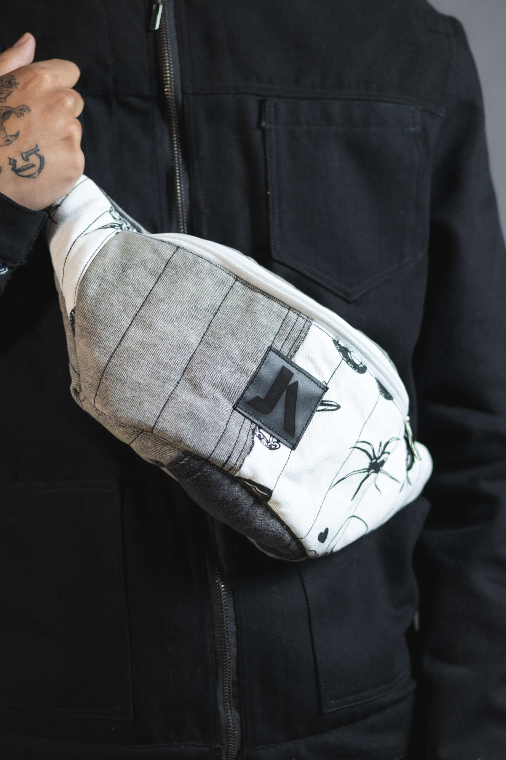 Canguro en denim elaborado artesanalmente con la técnica de patchwork.