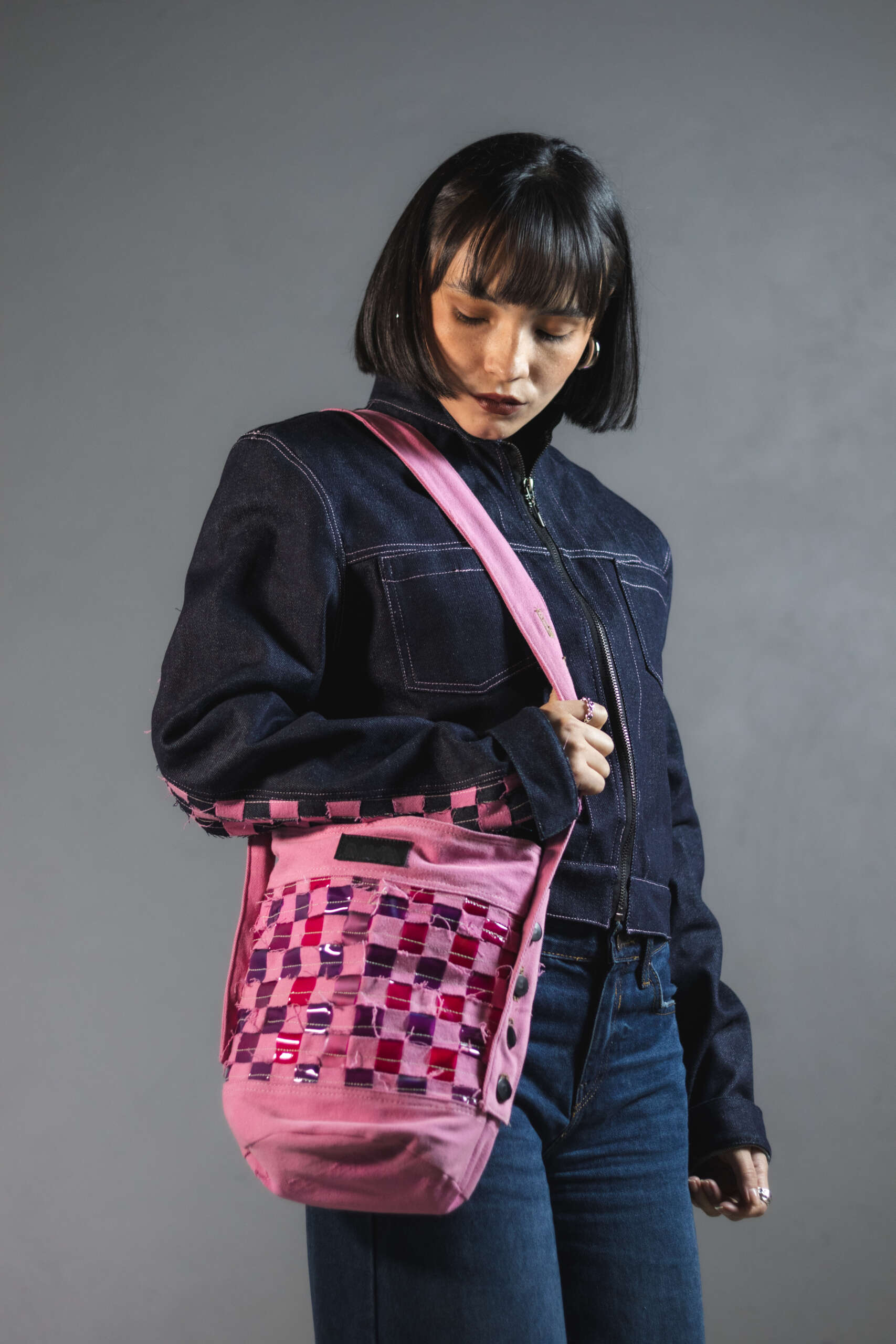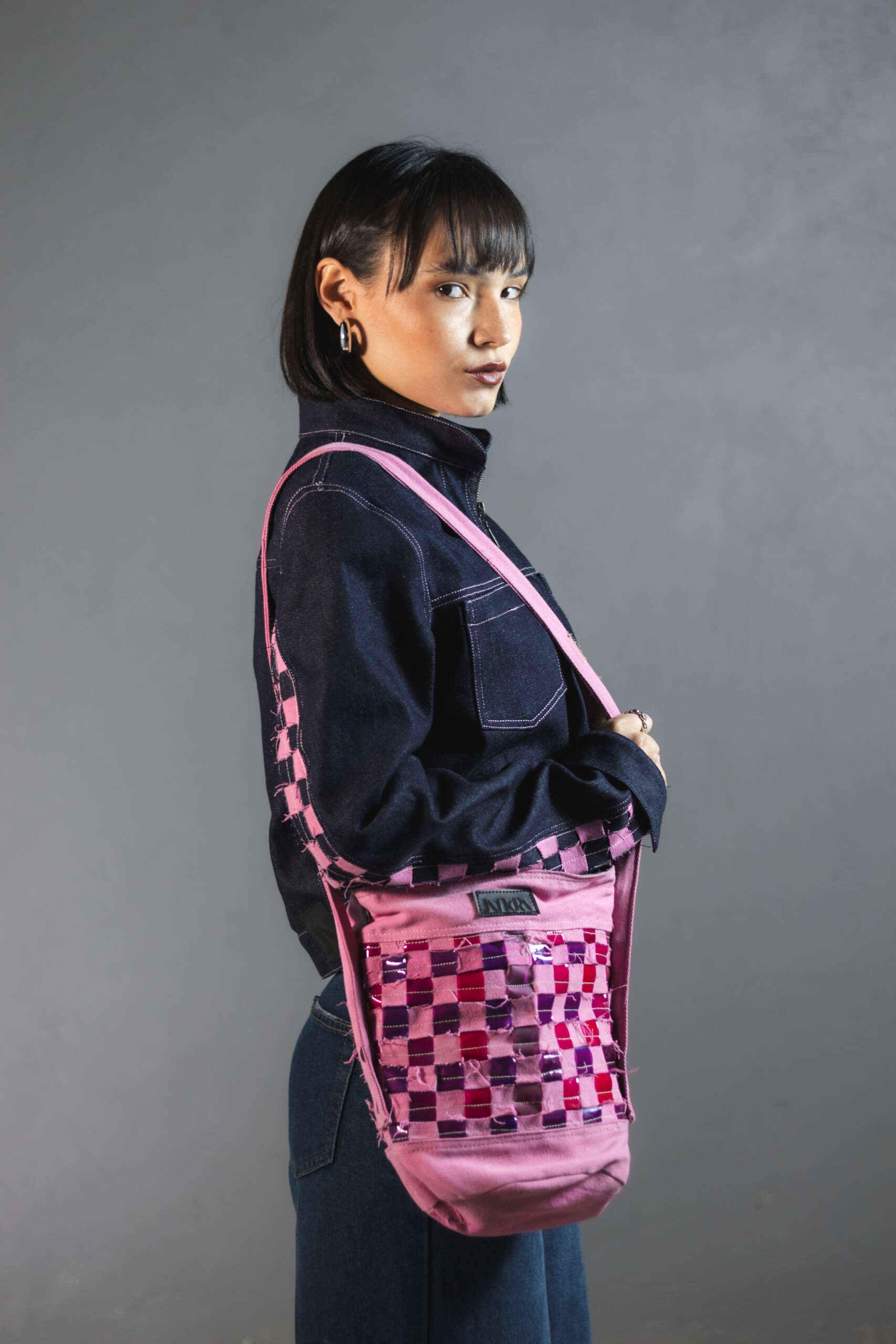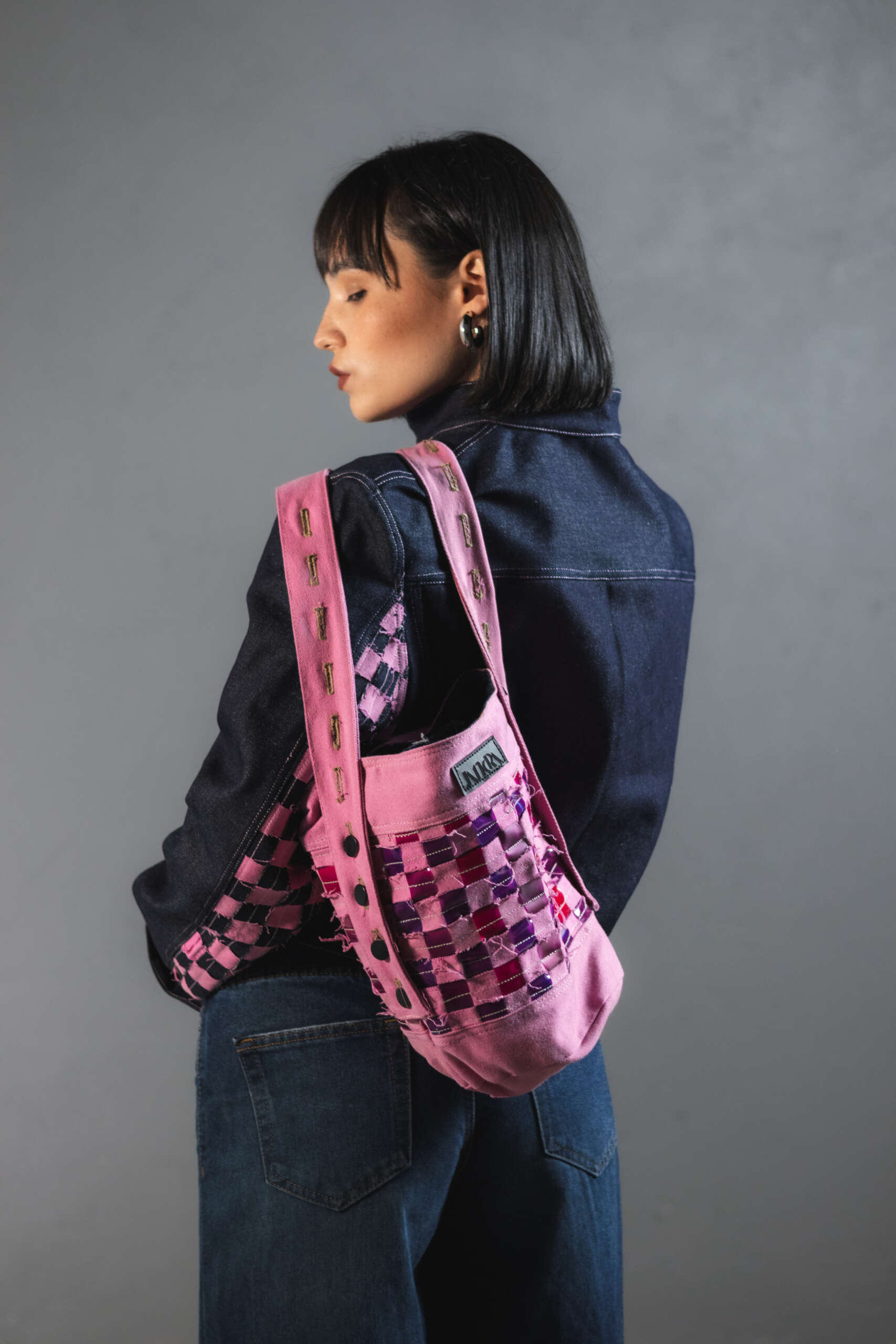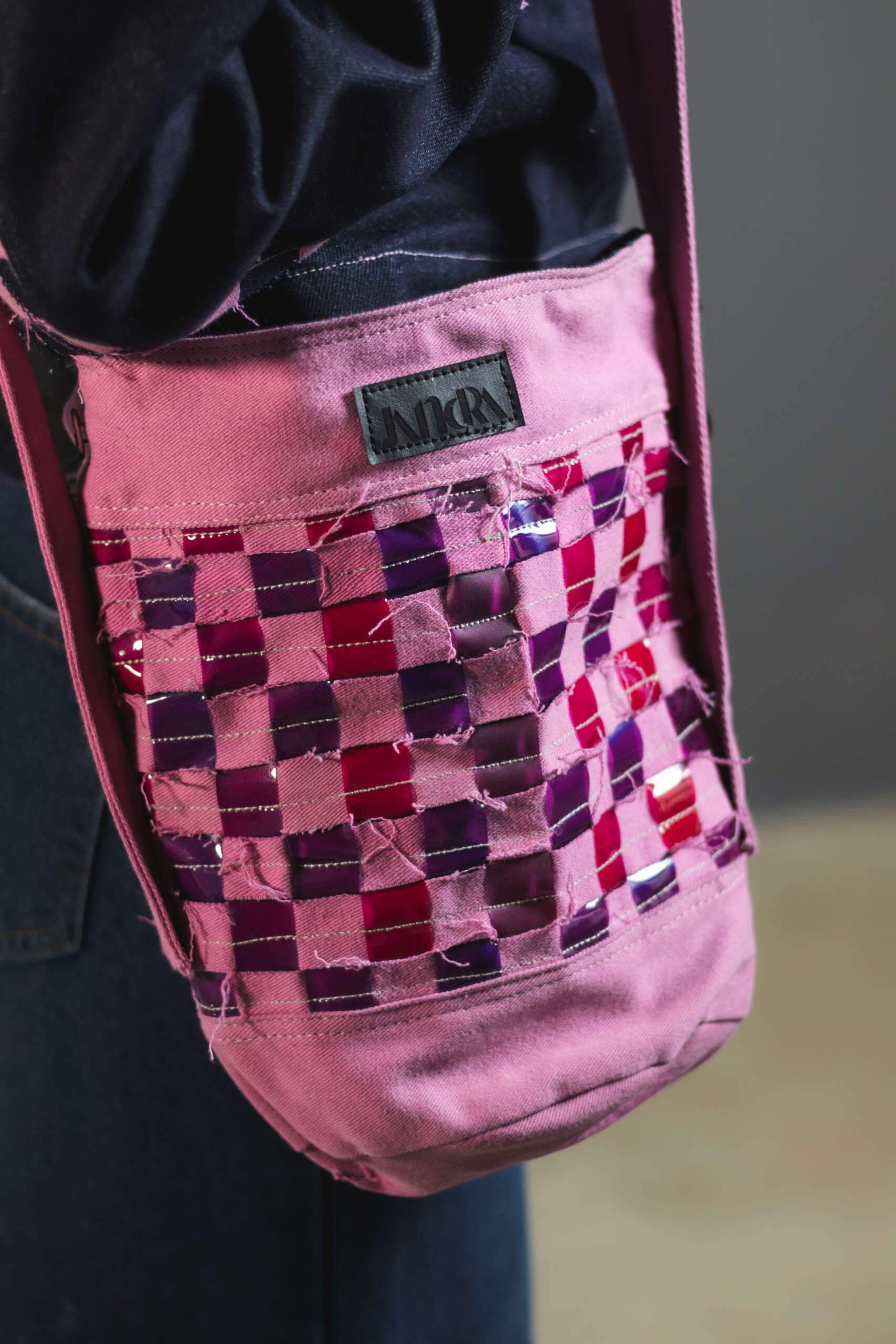 Con experimentaciĂłn textil compuestas por tiras de denim y vinilo fucsia entrelazadas una a una para generar textura y contraste. Una pieza irrepetible, creada con upcycling de alta calidad.
